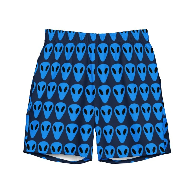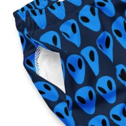 The standout feature of these swim trunks is the captivating repeat pattern of blue alien faces. Each face exudes a sense of curiosity and intrigue, inviting you to embrace your adventurous spirit. The playful design adds a touch of fun to your swimwear, ensuring you stand out with your unique style.