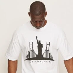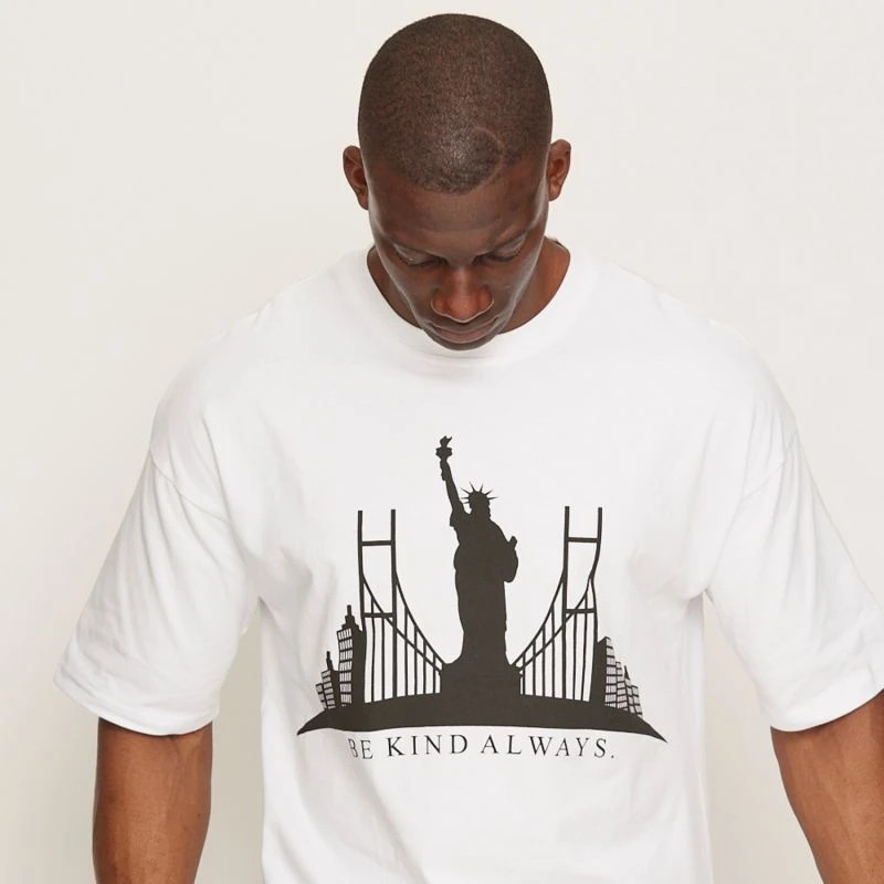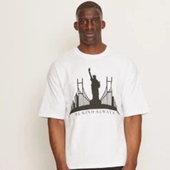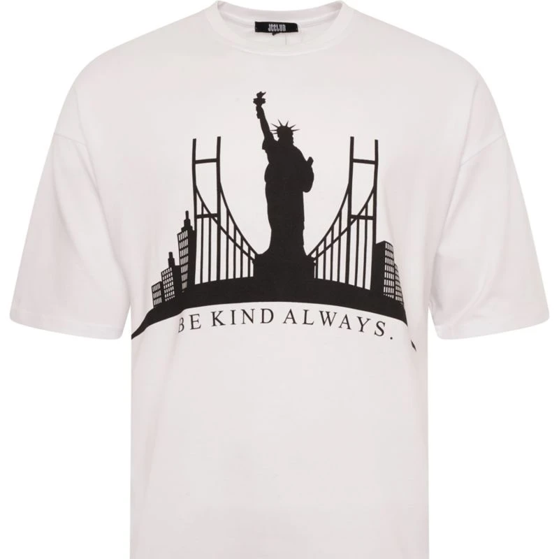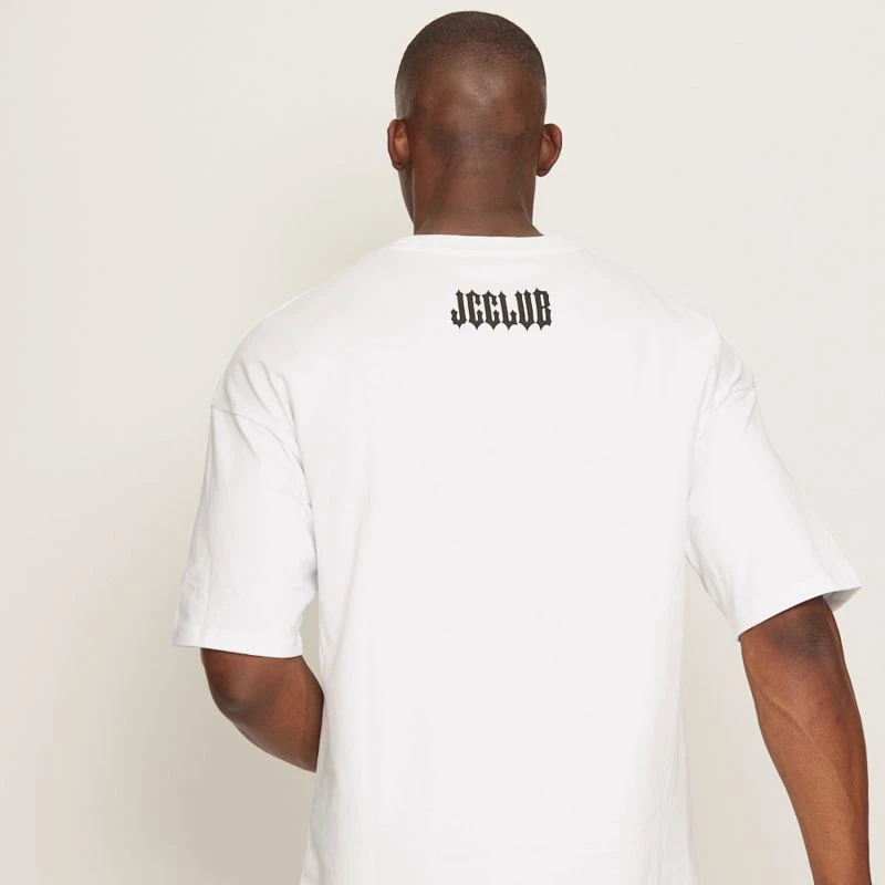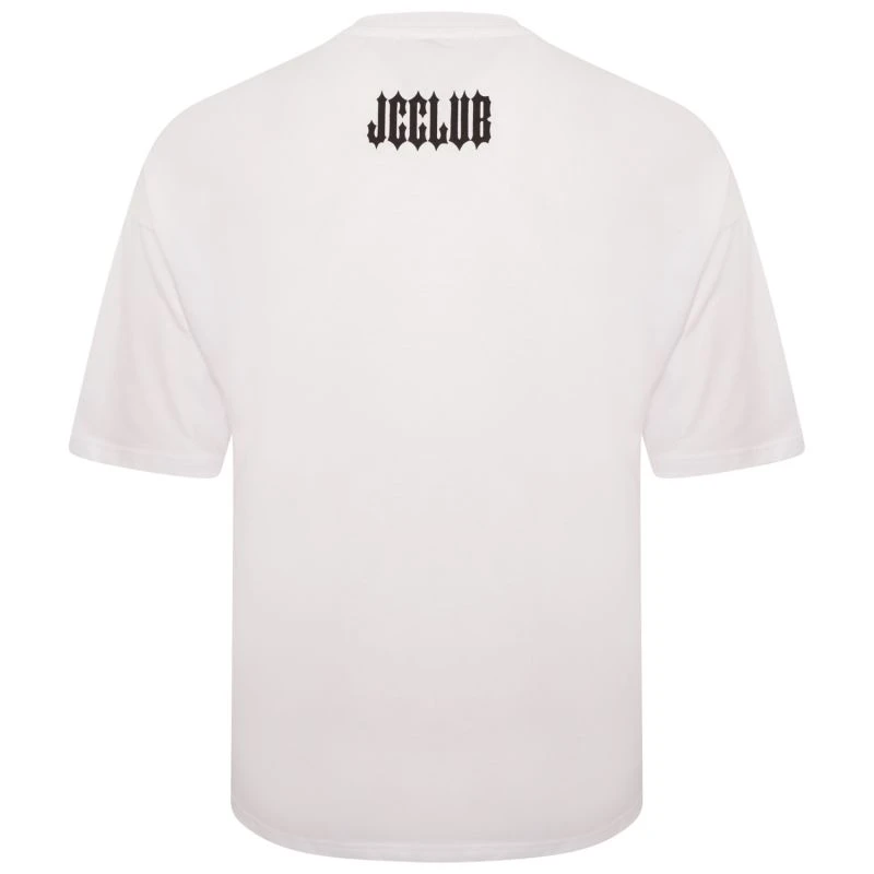 Short sleeves t-shirt in white with freedom statue graphic printed at front” JCCLUB ” Logo printed in black at back crewneck collar