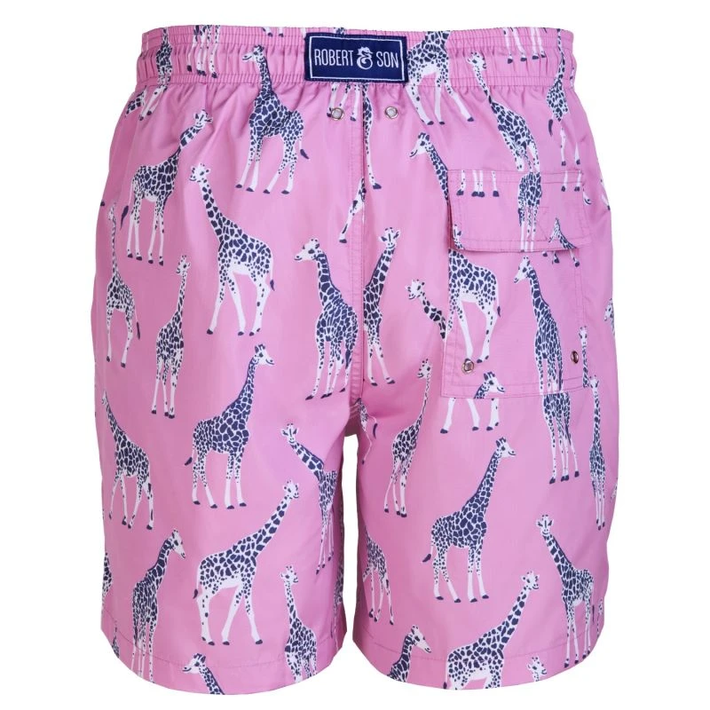 Quick dry fabric, pink swim shorts with black and white giraffe pattern. Complete with back pocket, elasticated waist, drawstring and soft lining.