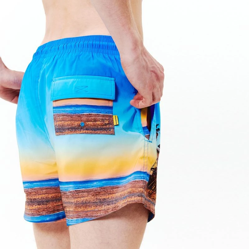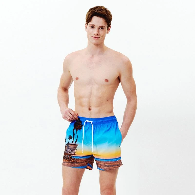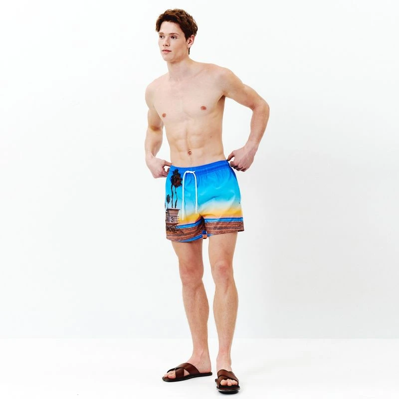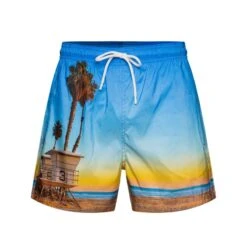 The iconic design showcases palm trees bathed in the orange glow of the sunset and the numbering of a lifeguard house.
