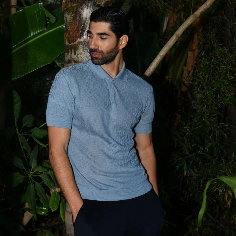 Jasper polo shirt is a timeless piece is something you will keep coming back to. Made from the designer’s new “Engraving” knit pattern is all about luxury, comfort and style. Its discreet transparency gives an airy feel. Lightweight with a soft feel and a relaxed regular fit with ribbed details, the designer’s polo shirt is a classic must piece in your wardrobe.