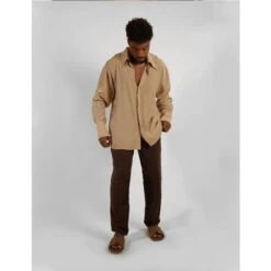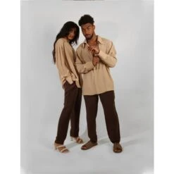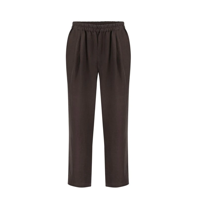 A brown unisex straight cut trouser. Crafted from a light-weight, breathable soft linen & cupro blend. Designed with an elastic waist & side pockets. 100% sustainable, 100% cruelty free. .