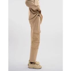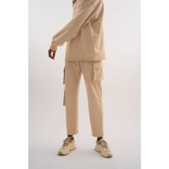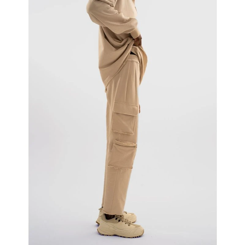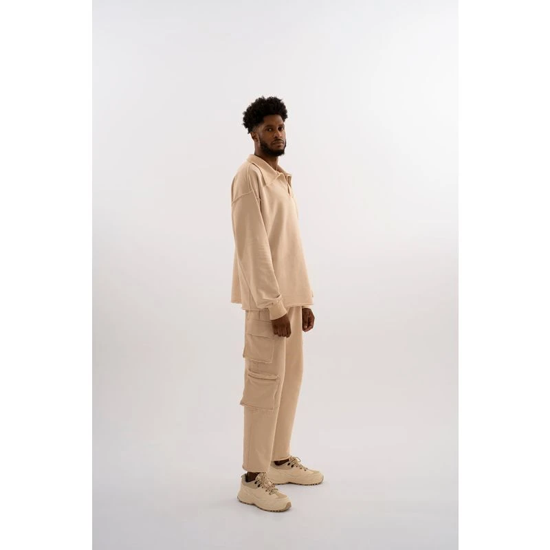 Our jogger essentials designed with a straight leg fit, side cargo style pockets, an elastic waist and a raw finish to be worn by both men & women. Made from 100% cotton in a medium weight fabric with a super soft finish in a sand shade. Matching sweater available.