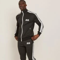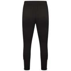 Long track pants in black elasticized waistband two-pocket styling JCCLUB Logo printed at front white stripes at side legs zip closure at ankle cuffs