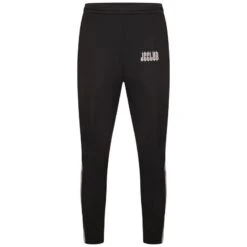 Long track pants in black elasticized waistband two-pocket styling JCCLUB Logo printed at front white stripes at side legs zip closure at ankle cuffs