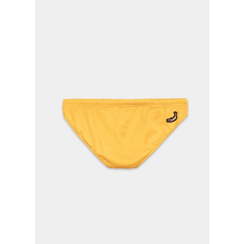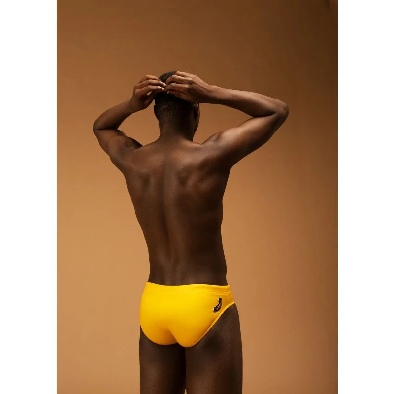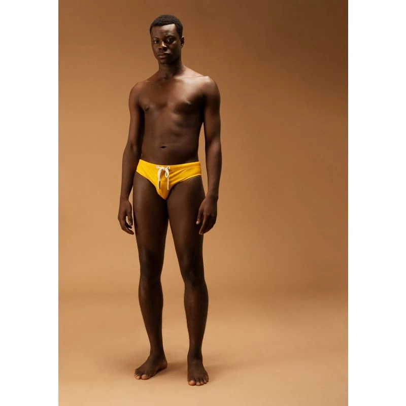 Eco-Friendly Low-Waist Swim Brief features a soft, jersey-knit fabric in solid Ocra color. Designed for a snug, low-waist fit, it’s crafted from ECONYL®, a regenerated nylon fiber made from pre and post-consumer waste such as fishing nets and other nylon waste. Key features include fast drying, a shaped pouch for comfort and support, and an adjustable tubular drawcord with enameled metal ends. Proudly designed and made in Italy, it’s a conscious choice for both style and sustainability.