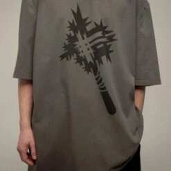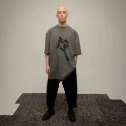 Loose-fit t-shirt with bespoke print designed by Áron Dimén, a Hungarian artist and tattooist. The pattern is in hommage to the ‘Busójárás’ tradition of the village of Mohács in Hungary, a six-day ritual where people dress up in monstrous costumes to chase away winter and evil spirits. The handcrafted wooden mace that’s referenced in the print is an emblematic part of the ensemble. The pattern is screen printed onto the garment by hand using a unique, eco-conscious dye. Each piece is produced ethically and locally in Hungary using certificated materials sourced from qualified European manufacturers.