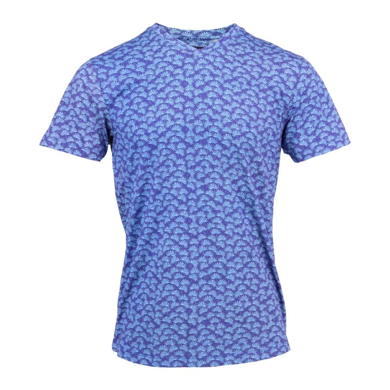 This classic V Neck Tee is 60% Cotton and 40% Modal. It is solid jersey and perfectly soft for everyday wear. This version is printed with a leaf pattern in azure and there are other options available in this style.