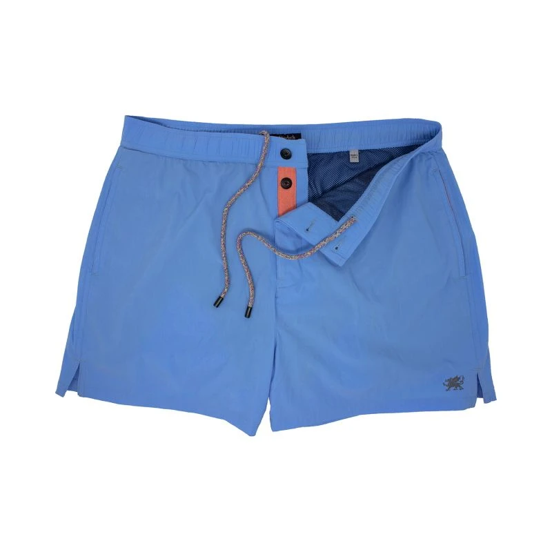 Our swim short is made with nylon and spandex for added stretch. The waistband has limited stretch, for the best fit. It also has a mesh liner, pockets, button fly and a snap closure on the back pocket. The interior has a custom, multi-color drawstring that is unique to the Lords of Harlech. This version is solid blue and is available in many other amazing colors and prints!