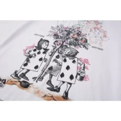 Design by Raf Reyes: It is explained in Lewis Carroll’s book that the spades (human soldiers cards) are gardeners, clubs are soldiers, diamonds are courtiers, and hearts are members of the royal family. I always loved gardening, watering your stuff out, whether they b investments, money trees [the perfect place for shade], or real trees/vegetation (naturae suprema – taking care of mother Gaia you dig?!). A beautifully laid out visual composition/collage by Raf comes announcing his own version of the Alice in Wonderland story for the 21st century, and subtle doubled-duplicated tonal prints and embroideries finish finessin’ the piece, and the master file at the back re-state in the VR®® Raf way how Lewis Caroll himself would have seen his work lent for aesthetically pleasing ends.