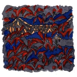 Farmers ride goods-ladened bicycles from Banana Island over Long Bien Bridge to the nearest market. Vermilion on dark cobalt.