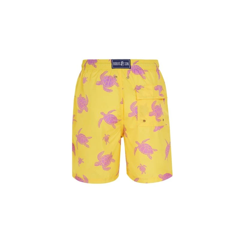 Quick-dry eco-friendly fabric, yellow swim shorts with a lilac turtle pattern. Complete with back pocket, elasticated waist, drawstring and soft lining. 90% Recycled Polyester 10% Spandex, Quick-dry fabric and soft lining, Elasticated waistband & drawstring, Two side pockets, Velcro back pocket, Leg length 43cm