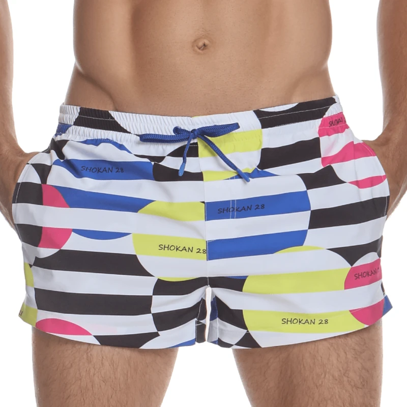 Our Shokan swim trunks bring a modern, 3″ inseam, in limited edition SHOKAN 28 iconic prints. This essential beach or pool wear piece is made with recycled post-consumer PET bottles turned into polyester.
