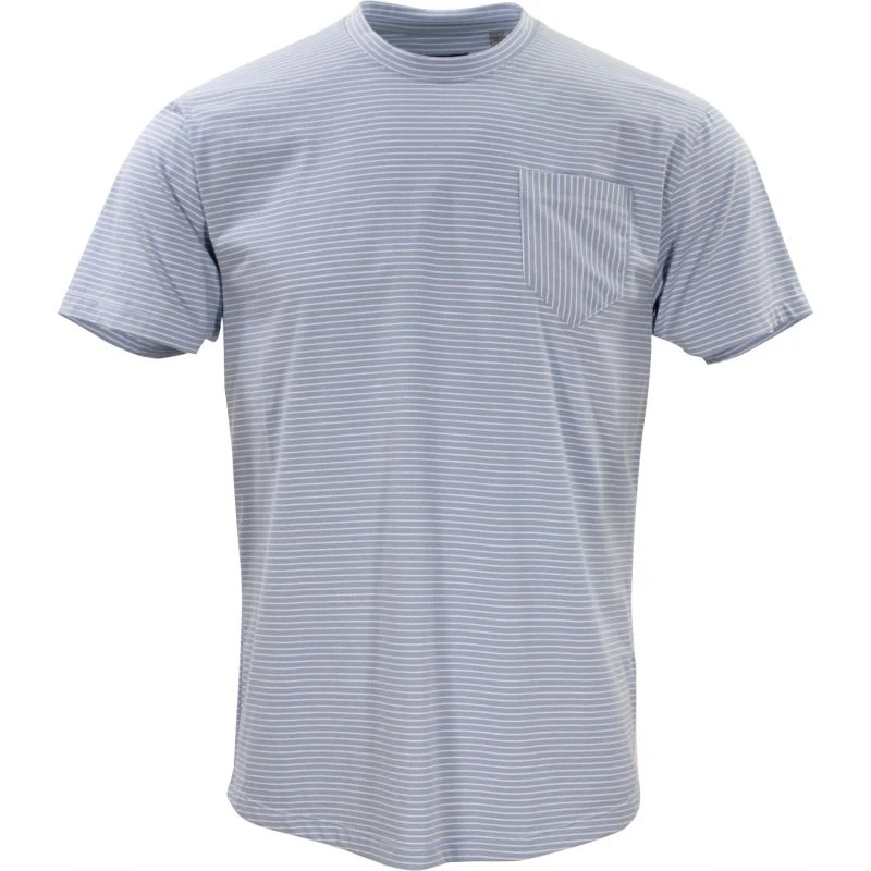 The Tate crew neck t-shirt is 95% Cotton 5% Spandex to give you the perfect combination of comfort and stretch. This super soft tee is a sky blue and white yarn dyed stripe. The vertical stripe chest pocket adds a nice detail and will become your new favorite tee.