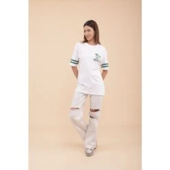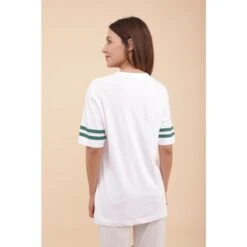 The t-shirt features fine dark green stripes on the sleeves, adding a touch of style. Whether you’re on the tennis court or going about your day, this versatile t-shirt is perfect. It can be worn on and off the court, paired with shorts, a skirt, or your favorite jeans.