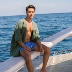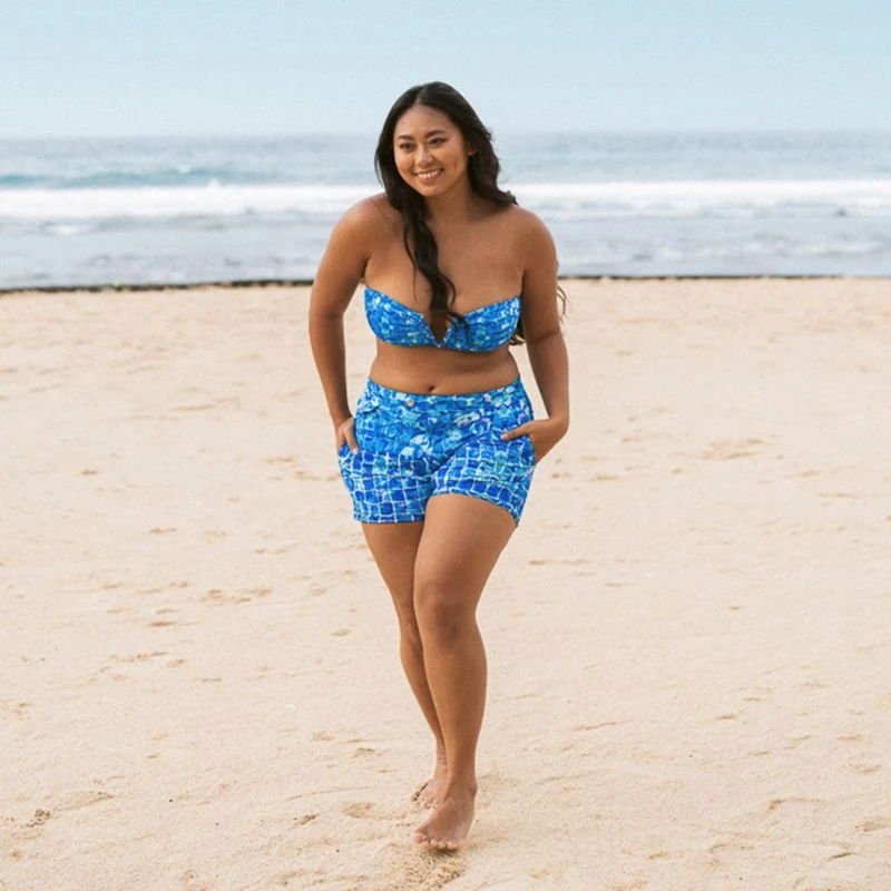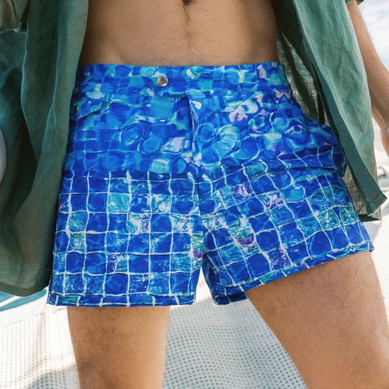 REPREVE® Mid-length swim shorts with pockets. Zip and button closure. Adjustable buckles at sides and mesh lining.